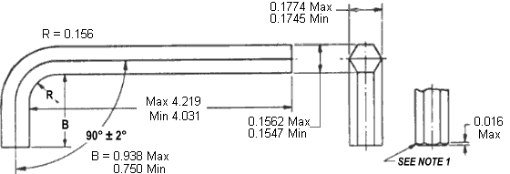| Wrench Size | Hexagon Width Across Flats | Hexagon Width Across Corners | Length of Short Arm | Length of Long Arm | Radius of Bend | Chamfer | Torsional Shear - Ave. | Torque Rating | ||||